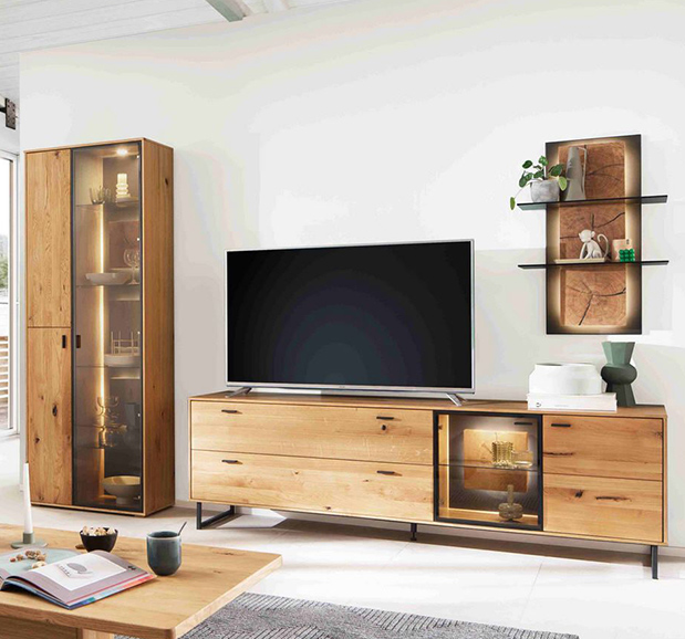 Wohnwände aus Wildeiche verleihen dem Wohnzimmer eine kraftvolle, zugleich ausgewogene Ausstrahlung. Die charakteristische Maserung der Wildeiche macht jedes Möbelstück einzigartig und sorgt für eine lebendige Optik, ohne den Raum zu dominieren. Gleichzeitig bieten diese Wohnwände durchdachten Stauraum für Mediengeräte, Bücher und persönliche Gegenstände und tragen zu einem aufgeräumten Gesamtbild bei. Die natürliche Robustheit der Wildeiche macht sie besonders langlebig und widerstandsfähig, was sie ideal für den täglichen Gebrauch im Wohnzimmer macht.