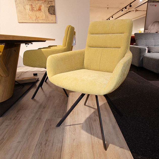 Der Stuhl LS-284522 verbindet wohnlichen Komfort mit moderner, klarer Formensprache. Der weich gepolsterte Sitz mit integrierten Armlehnen ist mit einem Stoff in warmem Gelb bezogen, der dem Essbereich einen freundlichen Farbakzent verleiht. Die Sitzhöhe von 50 cm und die Gesamthöhe von 90 cm sorgen für eine angenehme, aufrechte Sitzposition am Tisch. Mit einer Breite von 61 cm bietet der Stuhl ausreichend Platz, ohne am Tisch zu viel Raum einzunehmen. Das schlanke Metallgestell in Anthrazit matt wirkt leicht, steht dennoch sehr stabil und unterstreicht den modernen Charakter. Dank der Drehfunktion lässt sich der Stuhl bequem zur Seite schwenken, was das Aufstehen und Hinsetzen erleichtert und für spürbaren Alltagskomfort sorgt.