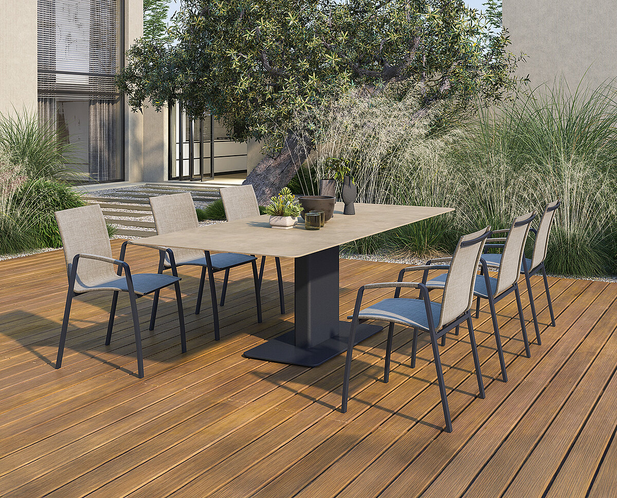 Leichte Pflege, hoher Sitzkomfort: strapazierfähige Materialien wie Aluminium, Edelstahl, Holz oder Geflecht mit wetterfesten Bezügen. Wahlweise mit Armlehnen, stapel- oder klappbar – perfekt kombinierbar mit unseren Gartentischen für Terrasse, Balkon und Garten.